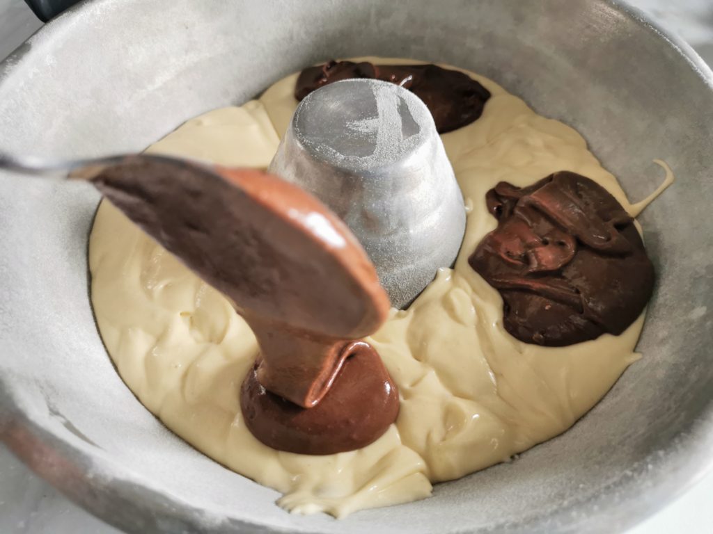 Quando il cacao si è ben amalgamato al composto, versatelo a cucchiaiate intervallate sull'impasto bianco come da foto.