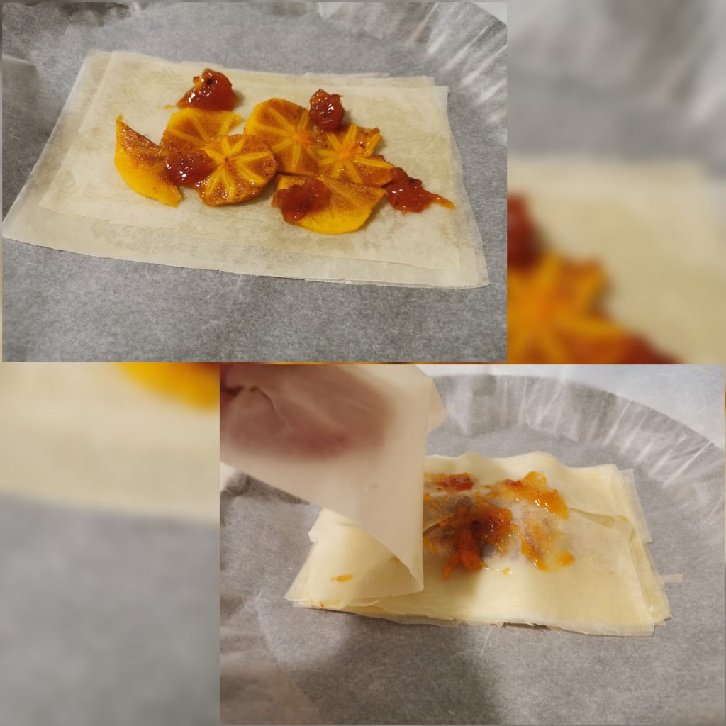 Disponete il primo rettangolo di pasta fillo (un foglio per volta) su una teglia foderata con carta forno, spennellate con il burro fuso, sovrapponete un secondo rettangolo di fillo, spennellate con il burro fuso e farcite con le fettine di cachi e i ciuffetti di marmellata.